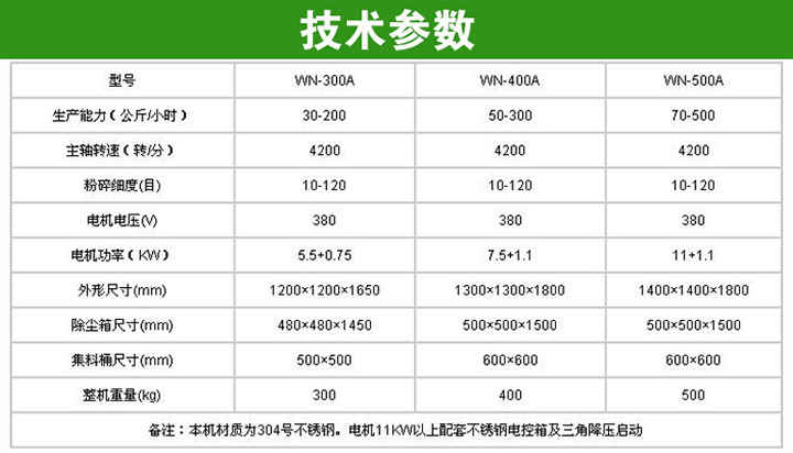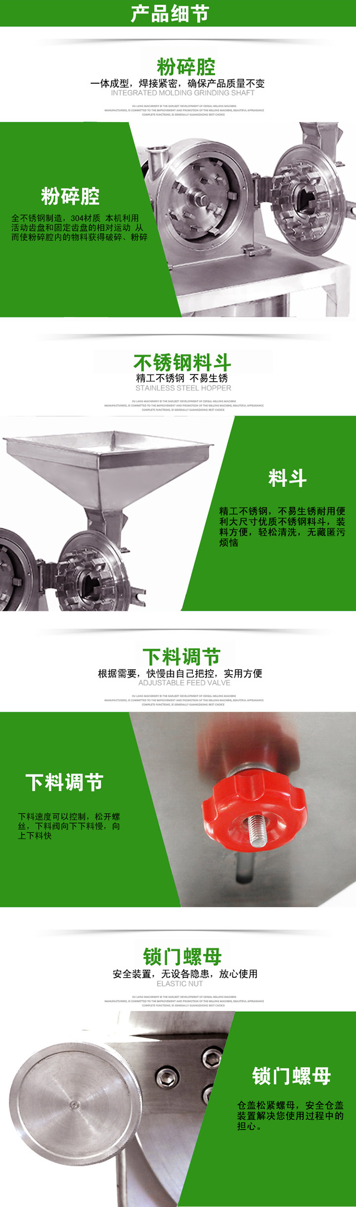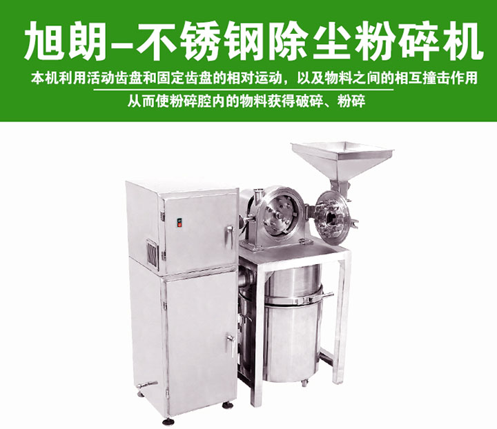 不銹鋼除塵萬(wàn)能粉碎機 全不銹鋼制造,304材質(zhì),符合GMP要求 一.不銹鋼除塵粉碎機用途: 主要適用于制藥、化工、食品等行業(yè)的物料粉碎。不適合粉碎含油量高(如芝麻、核桃、瓜子仁、菜籽等)、粘性的物 料,因為含油量高和粘性物料很容易堵塞篩網(wǎng)。 二.工作原理: 不銹鋼萬(wàn)能除塵粉碎機利用活動(dòng)齒盤(pán)和固定齒盤(pán)的相對運動(dòng),以及物料之間的相互撞擊作用,從而使粉碎腔內的物料獲得破碎、粉碎。本 機配備篩網(wǎng),篩網(wǎng)可以根據客戶(hù)要求進(jìn)行更換,當物料被粉碎到小于篩孔直徑時(shí),粉劑從篩網(wǎng)中出來(lái),落入下方的集料 桶內,在桶內飄揚的粉塵則通過(guò)除塵電機的作用被吸入到除塵箱內的除塵袋中過(guò)濾,空氣由風(fēng)機排出室外。 三.機器特點(diǎn): 1.結構簡(jiǎn)單,粉碎腔裝、拆簡(jiǎn)便,容易清洗。 2.運轉平穩,噪音小,振動(dòng)小。 3.操作簡(jiǎn)單。更換篩網(wǎng)可以控制粒度的大小。 四.注意事項: 1.本機在外接電源應根據機器功率加裝合適的斷路器,目的是在機器負荷過(guò)大,電流過(guò)大時(shí)自動(dòng)切斷電源,以保護電 機! 2. 本機在工作時(shí)確保有專(zhuān)人看管。 3.被粉碎的物料顆粒不宜過(guò)大,如遇悶機(即機器因負荷過(guò)大導致轉速明顯變慢或者被動(dòng)地停止運轉),應該馬上斷 掉電源。 3.如果被粉碎的顆粒過(guò)大,應該要經(jīng)過(guò)萬(wàn)能破碎機的破碎后,再用本機粉碎。