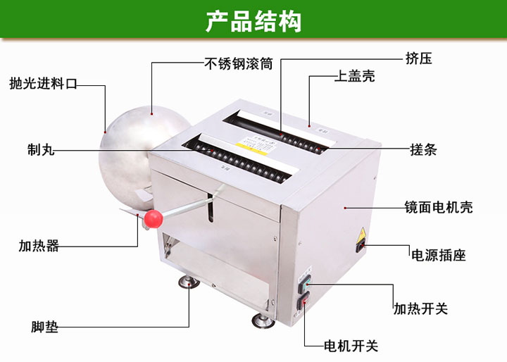2、本機連續出條、搓丸、烘干一次完成,且丸型光圓大小均勻,不易破碎,無(wú)需進(jìn)行篩選;