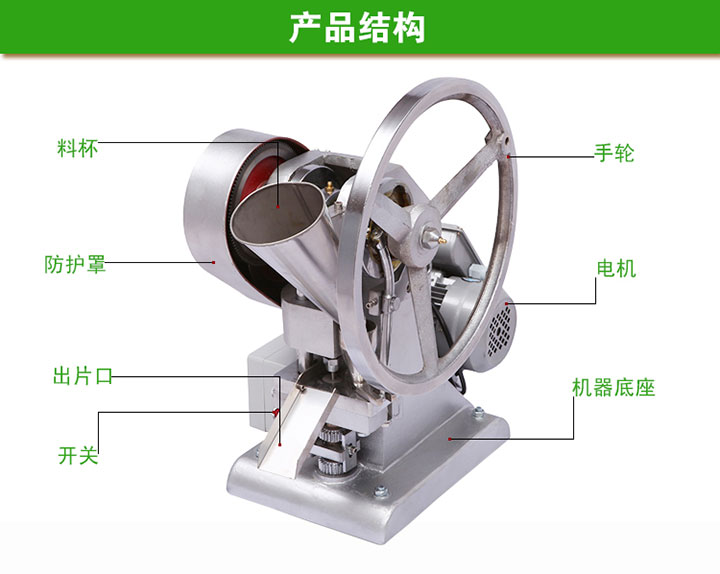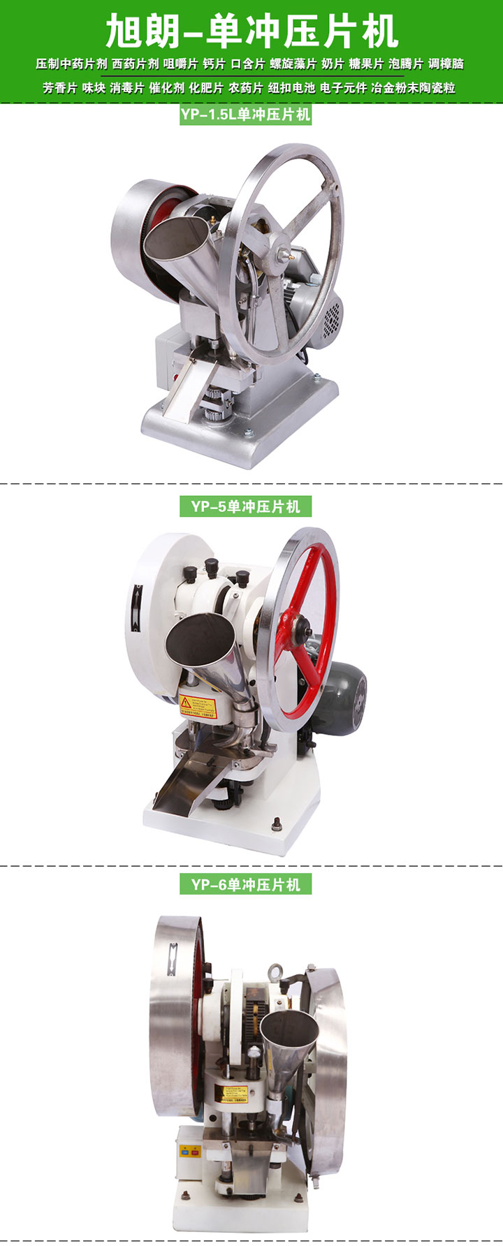 形狀的模具。 單沖壓片機能將粉粒狀原料壓制成片劑,可廣泛適用于制藥廠(chǎng)、化工廠(chǎng)、醫院、科研單位、實(shí)驗室試制