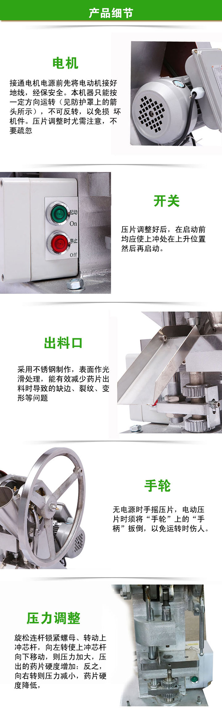 沖模,物料的充填深度,壓片厚度均可調節,能適應制藥行業(yè)壓制各種中、西藥征劑的要求和其它行業(yè)壓制各種類(lèi)似產(chǎn)