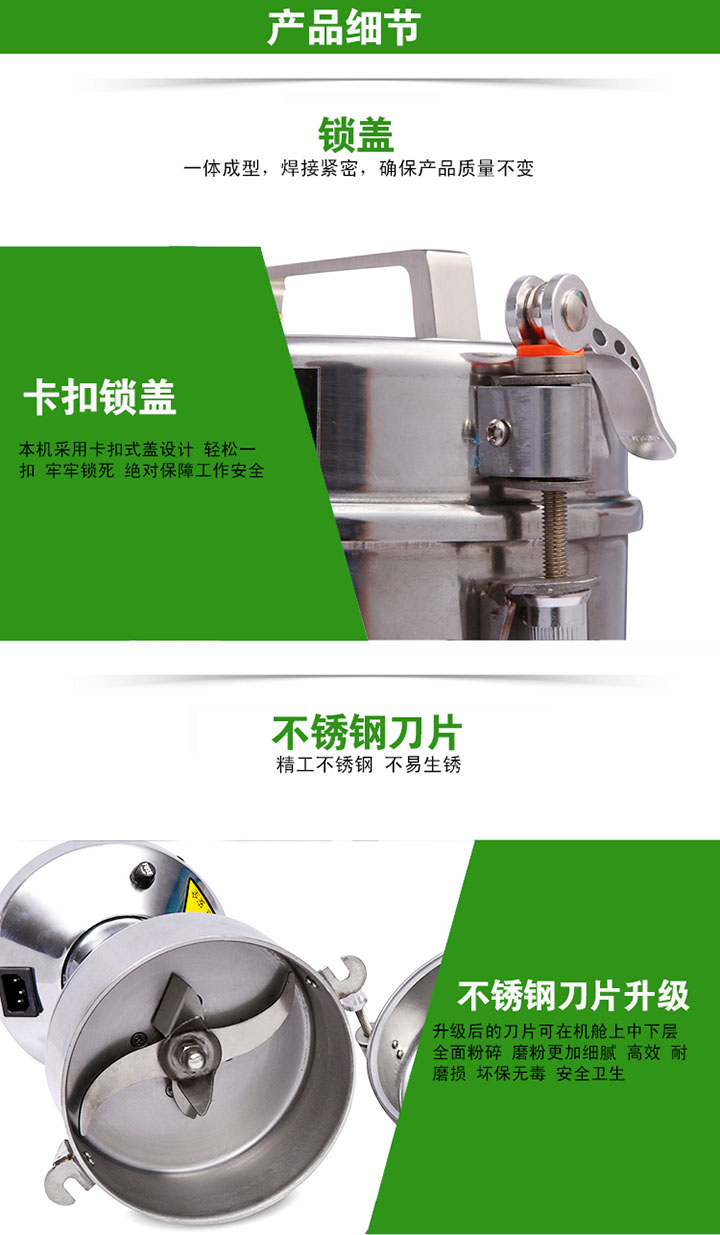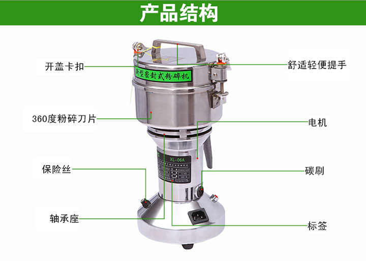 2、本機優(yōu)點(diǎn)是:粉碎室和蓋子未采用傳統的螺紋旋合設計,采用密封圈密封免螺絲設計,操作更方便。避免