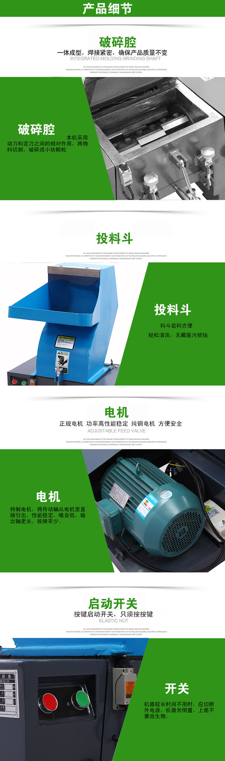 一.本司生產(chǎn)的全能破碎機結合了國內外行業(yè)的經(jīng)驗后改造生產(chǎn)的破碎設備,具有質(zhì)量輕,能耗低 ,刀片材料優(yōu)良,使用壽命長(cháng),清洗方便等優(yōu)點(diǎn)。 ★ 機器外表美觀(guān)大方,配色協(xié)調,噴漆牢固。 ★ 入料斗、破碎室、篩斗是分離設計,裝卸容易。 ★ 緩沖室進(jìn)料與進(jìn)口垂簾式設計,避免材料飛濺。 ★ 破碎室前后壁采用雙層隔音,噪音低。 ★ 皮帶輪設有保護罩,安全可靠。 ★ 設有清洗保險掣。 ★ 馬達裝上過(guò)荷保護裝置與電源連鎖保護系統。 ★ 采用進(jìn)口工具鋼,刀具耐用,刀具安裝設計可伸縮調整,用鈍后可多次刃磨,反復多次使用,使 用壽命長(cháng)。 ★ 加工工藝成熟,箱體、刀架等重要部件采用整體加工,確保配合精度。動(dòng)刀座為梯級剪式設計,使切削受力分解 ,造成切削力成倍增長(cháng)。 ★ 結構合理,操作方便,省電耐用,實(shí)用經(jīng)濟。 ★ 通用型塑料破碎機,采用密封軸承,使軸承轉動(dòng)長(cháng)時(shí)間保持良好,刀型設計合理,產(chǎn)品成粒均勻,刀座熱縮處理 ,外形設計美觀(guān)大方。 二.本機適用于中草藥、化工材料、硬度較低的礦石以及聚苯乙烯、聚丙烯、尼龍、工程塑料和聚氯泡 沫軟料的廢、次品或注射噴頭等破碎之用。如更換相應的篩孔板,并調整刀片間隙,還可破碎各種吹塑 膜、壓延膜、薄片、薄板等塑料廢品。 技術(shù)參數: