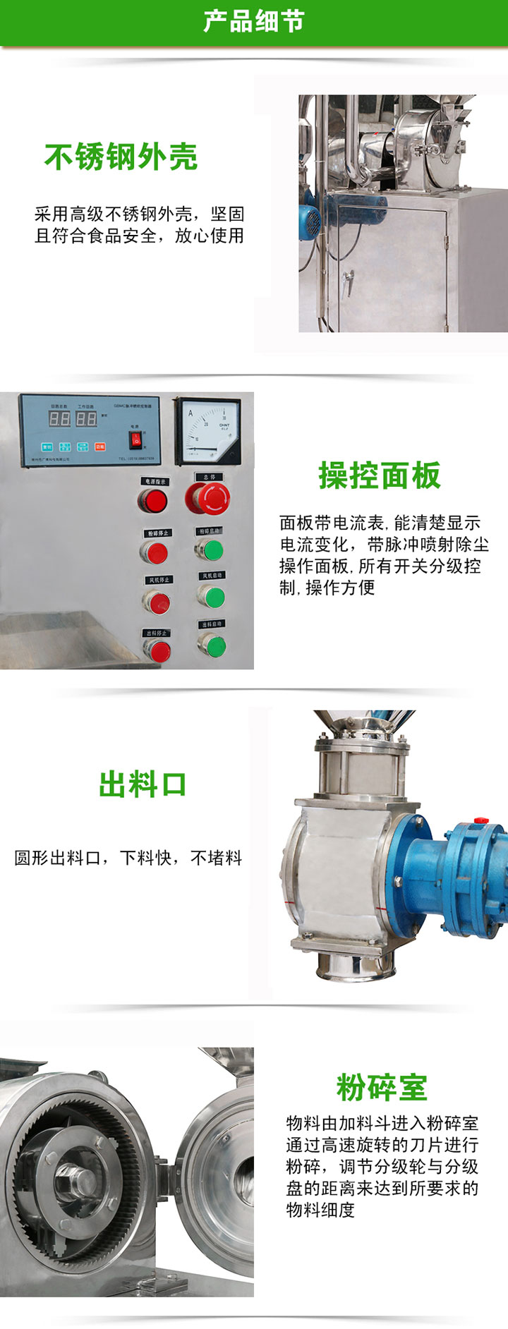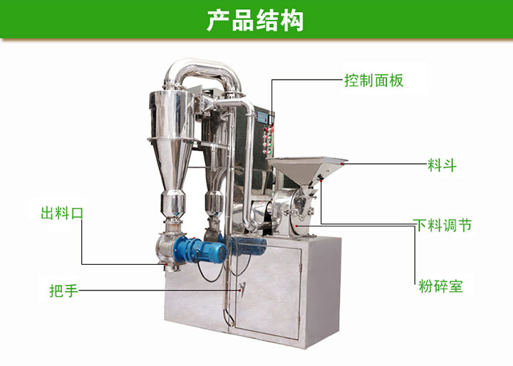 吸塵箱等部分組成,物料由加料斗進(jìn)入粉碎室,通過(guò)高速旋轉的刀片進(jìn)行粉碎,調節分級輪與分級盤(pán)的距離來(lái)達到