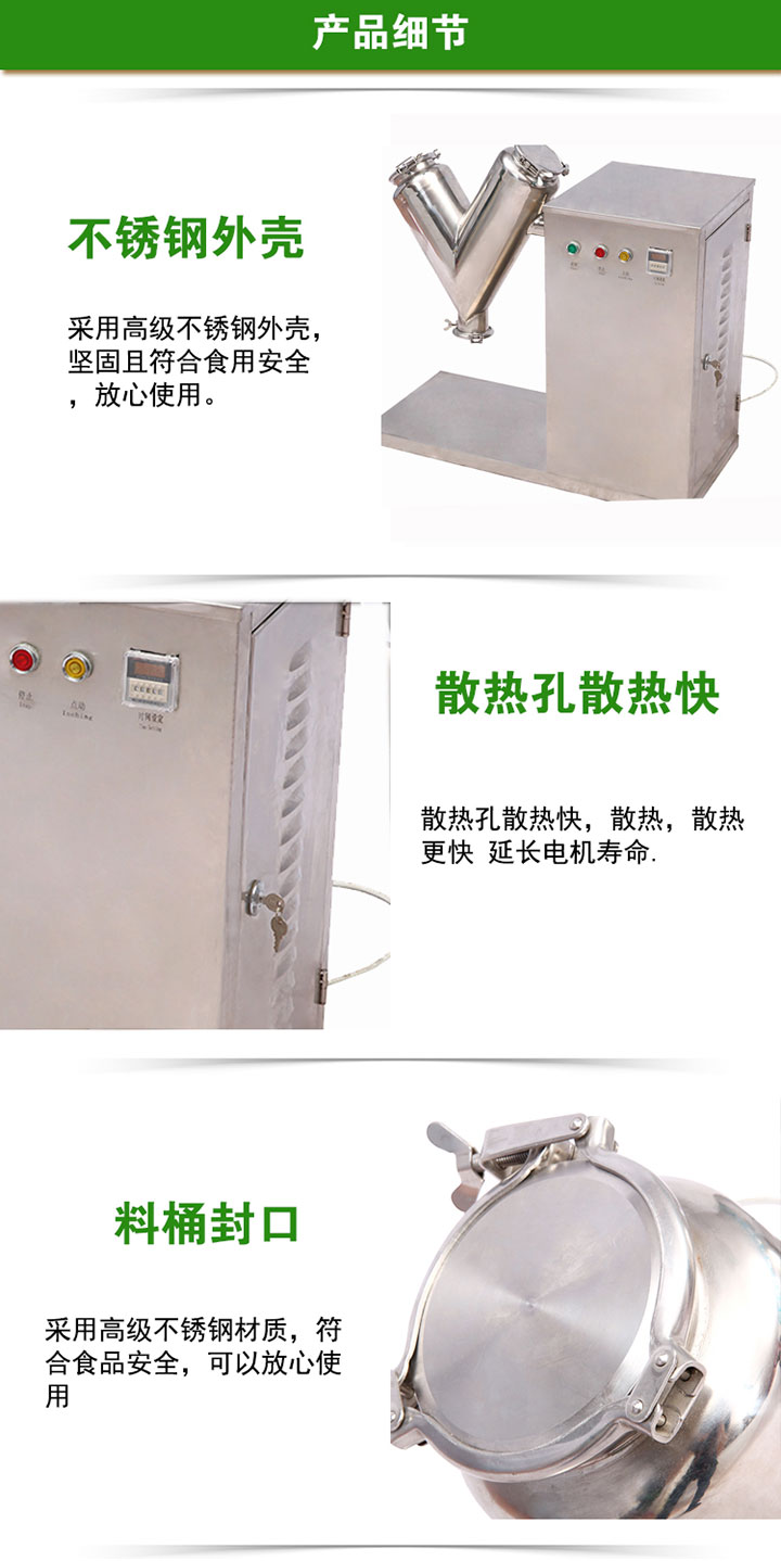 以保持物料顆粒完好無(wú)損,本機混合筒采用不銹鋼制造,對混合物料無(wú)任何污染。另外,本機還裝有定時(shí)裝置,可以