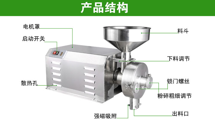 2、出粉口加裝了4顆強磁裝置,吸附機器運轉過(guò)程中磨片磨損所產(chǎn)生的鐵粉,保證了食品衛生與安全;