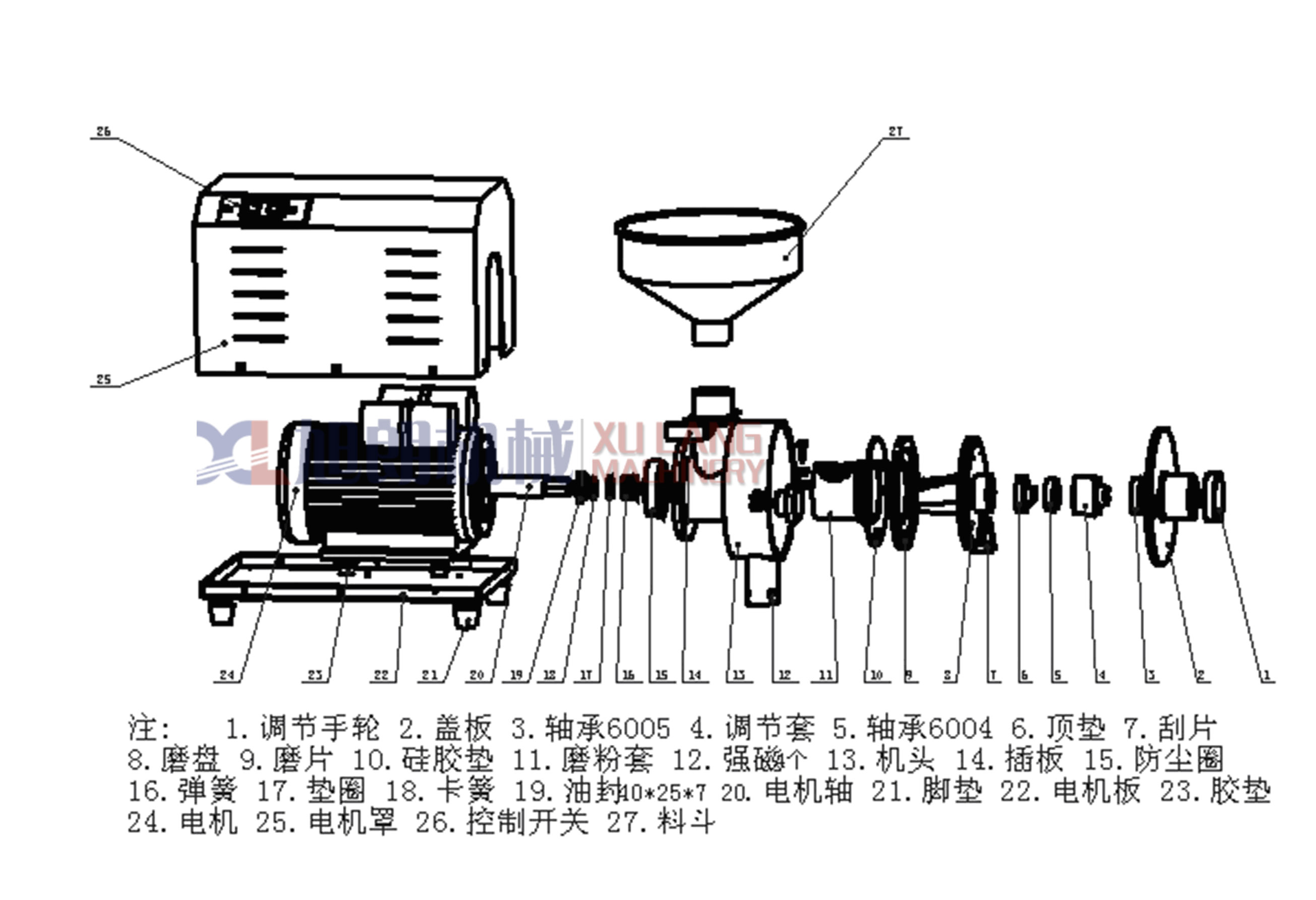 2、磨粉機一定要外接斷路保護(過(guò)載保護)裝置,以保護電機和人身安全。