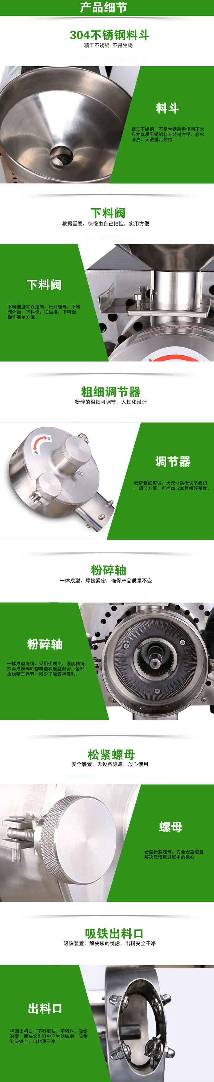 4、啟動(dòng)電源,運轉1分鐘左右,將物料放進(jìn)料斗,將調節器擰至適當位置,打開(kāi)下料擋板,使物料緩慢地流進(jìn)磨粉腔。